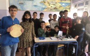 Στα πλαίσια του μαθήματος της Ιστορίας οι μαθητές της Α’ Γυμνασίου γνώρισαν τα αρχαία μουσικά όργανα. Με πρωτοβουλία της εκπαιδευτικού Μ. Βλαβιανού, πραγματοποιήθηκε δανεισμός της μουσειοσκευής από το μουσείο της Ακρόπολης. Το “βαλιτσάκι” περιείχε πιστά αντίγραφα αρχαίων μουσικών οργάνων όπως λύρας, αυλού, σάλπιγγας, κυμβάλων, τυμπάνου κ.α. Τα παιδιά μέσα από την παρατήρηση γνώρισαν έγχορδα, πνευστά και κρουστά όργανα της αρχαιότητας και προσπάθησαν να βγάλουν ήχο από το καθένα! Κατανόησαν την αξία της μουσικής ως μέσο για την ανατροφή των νέων στην Αρχαία Ελλάδα και σίγουρα ψυχαγωγήθηκαν.